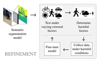 The quality of semantic image segmentation models can be affected by external factors such as weather or daytime. Those factors can lead to safety-critical mistakes. In this work, we propose a systematic approach to detect and alleviate such weaknesses of semantic segmentation models. We systematically evaluate a semantic segmentation model under different external factors and analyze which factors have the largest impact on the performance. Then, we collect new training data under the most harmful external factors and fine-tune the model. We use the CARLA simulator to obtain driving data under various environment settings. We deploy a state-of-the-art semantic segmentation model in two distinct driving environments. Then, we use the proposed process to detect which external factors affect model performance the most. We collect new training data under those factors and fine-tune the model. The proposed approach outperforms collecting the same amount of random additional data by up to 10.6%. Our results show the benefit of using an iterative refinement approach as opposed to merely collecting larger data sets. Finally, we use the knowledge about which factors affect performance the most to train a simple decision tree classifier to predict the model’s performance given the current external factors. Problematic environments can be detected at an average accuracy of 87.5%.